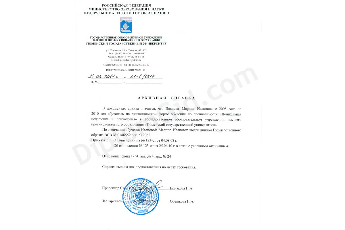 Архивная справка из ВУЗа или ССУЗа (справка, подтверждающа факт обучения и получения диплома). Заполнение по форме учебного заведения, с печатью и подписями. Цена: 8 000 руб. (4 000 руб. при заказе с дипломом о высшем образовании)  |