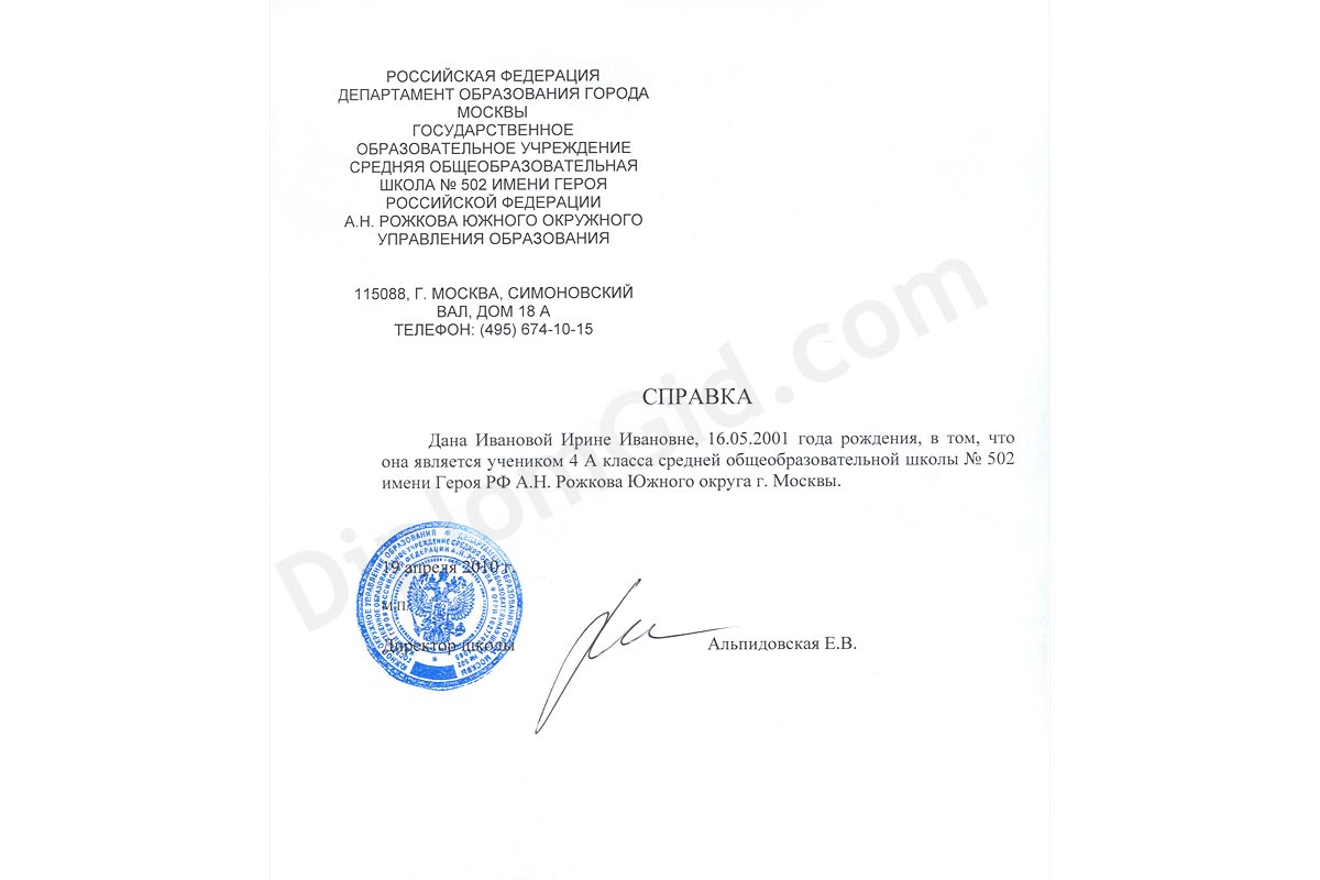 Справка об обучении в школе. Заполнение по форме выбранной Вами школы с печатью и подписью директора. Цена: 8 000 руб. (Заказывая справку у нас, Вы получаете скидку 2000 рублей на последующий заказ аттестата за 11 или 9 класс)  |